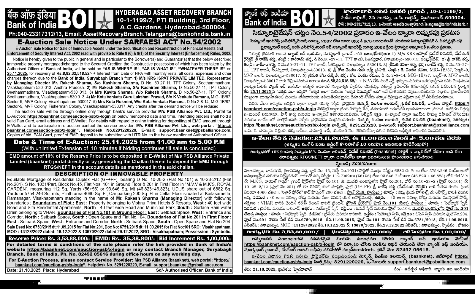 Bank of India Auctions for Residential property in Visakhapatnam, Andhra Pradesh